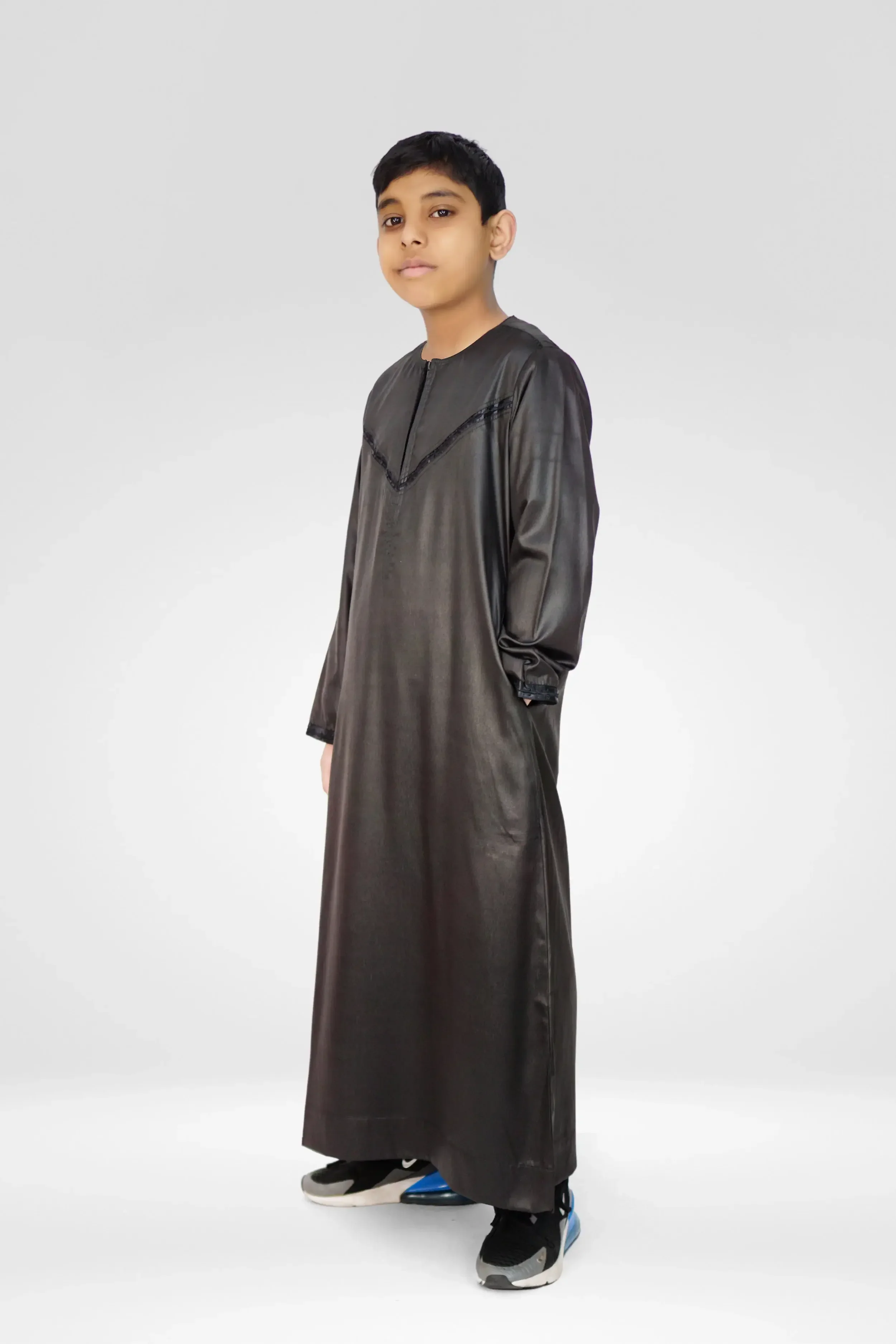 Kids Thobe Shiny Collarless Omani Style With Zip- Black