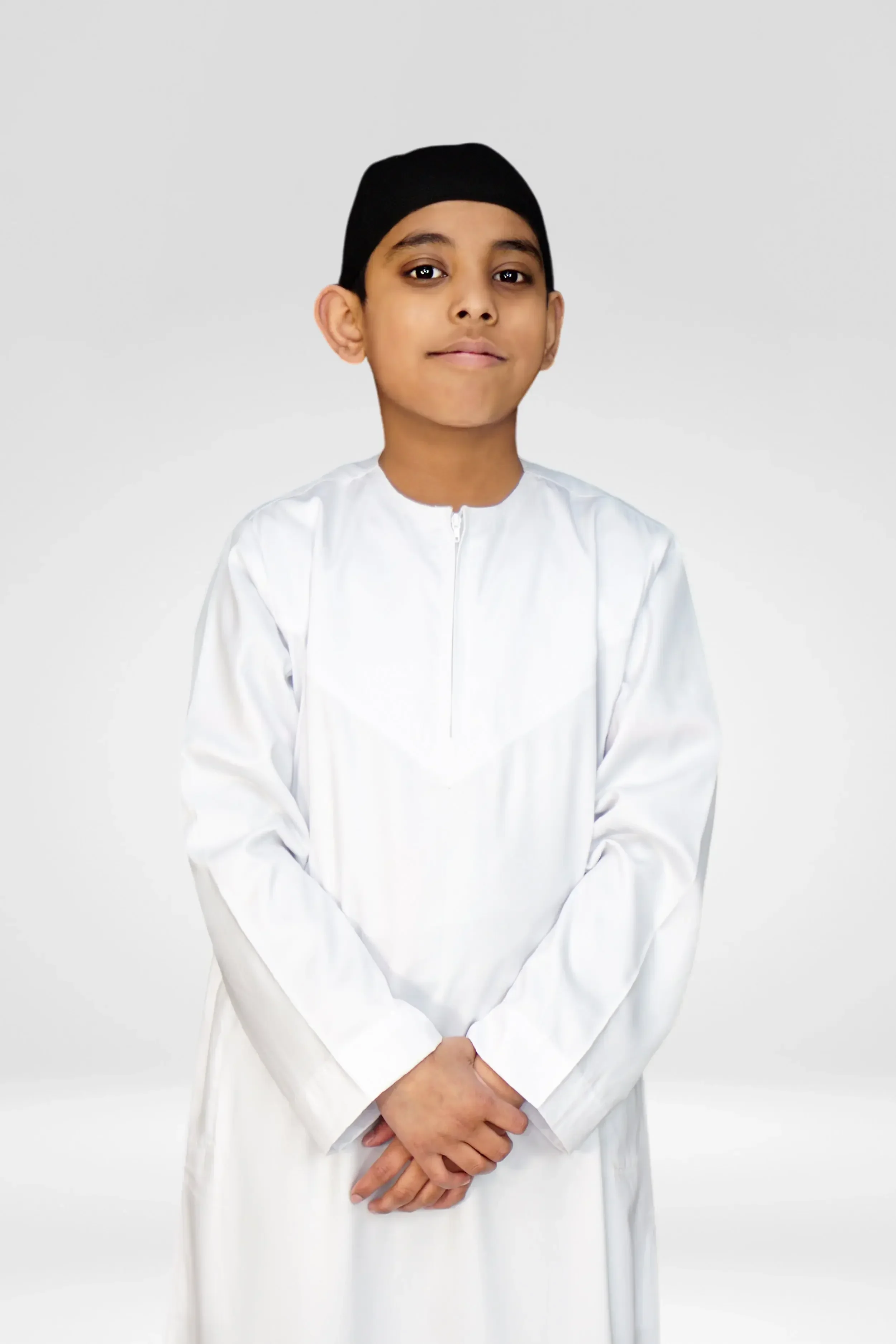 This Omani Style Collarless Kids Thobe in White blends traditional charm with modern functionality. Its clean and minimalistic design makes it versatile for both special occasions and casual outings, while the zip closure ensures ease of use for little ones.