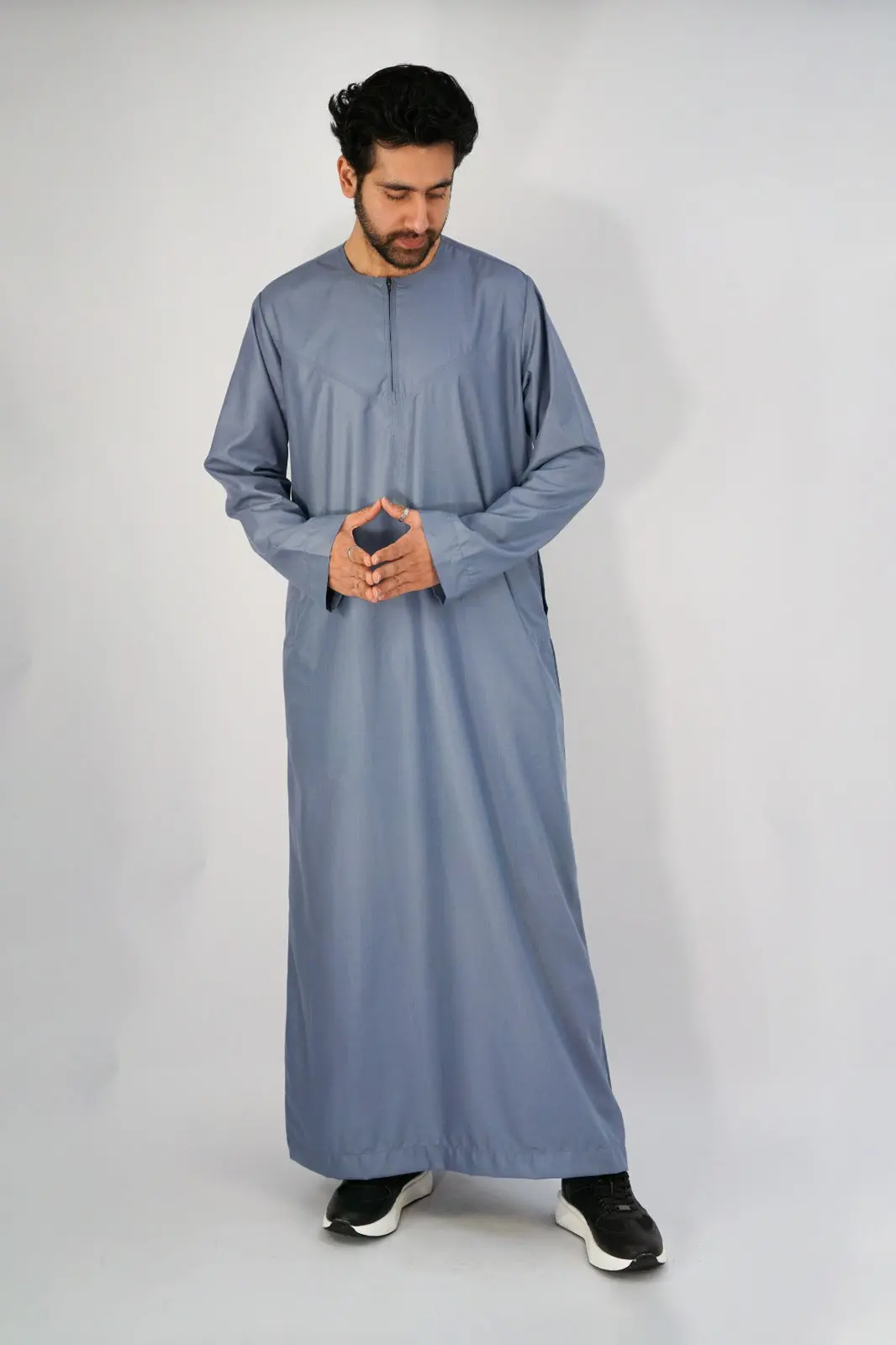 Omani Thobe Premium With Front Zip – Sky Blue is a modern take on traditional menswear, blending classic Omani elegance with everyday practicality. Tailored in a refreshing sky blue shade, this thobe offers a clean, refined look perfect for various occasions.